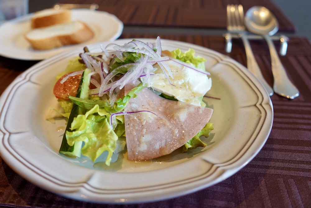 最初のサラダはハムや生ハムも乗っていて贅沢な感じ!